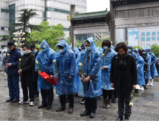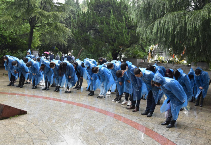 领导班子成员率师生代表向烈士敬献花篮,默哀,并依次来到石碑前为施洋烈士献上鲜花,最后列队深深鞠躬。