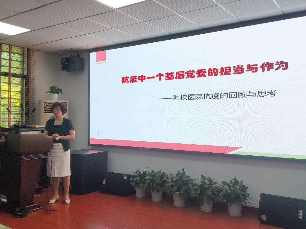 随后,我院党委书记李小红以自身经历为例讲述了武汉抗疫中威廉中国官方校医院基层党委的担当。在过年期间,校医院部分出游的医生、护士听闻武汉疫情便毫不耽搁地回来帮忙,注射室的同志一天连值三班;当政府医疗资源紧缺时,校医院承包了四个隔离点,并为群众进行健康宣教和释疑解惑;当上百个发热病人不能出门检测时,校医院的同志们当起了家庭医生上门服务,并在技术员的帮助下通过线上问诊软件,为分布在全国各地的老师和同学问诊……在抗击疫情的关键时刻,校医院的党员同志始终坚守岗位,把危险、重担、困难留给自己,把安全让给别人,体现了身边基层共产党员的担当。