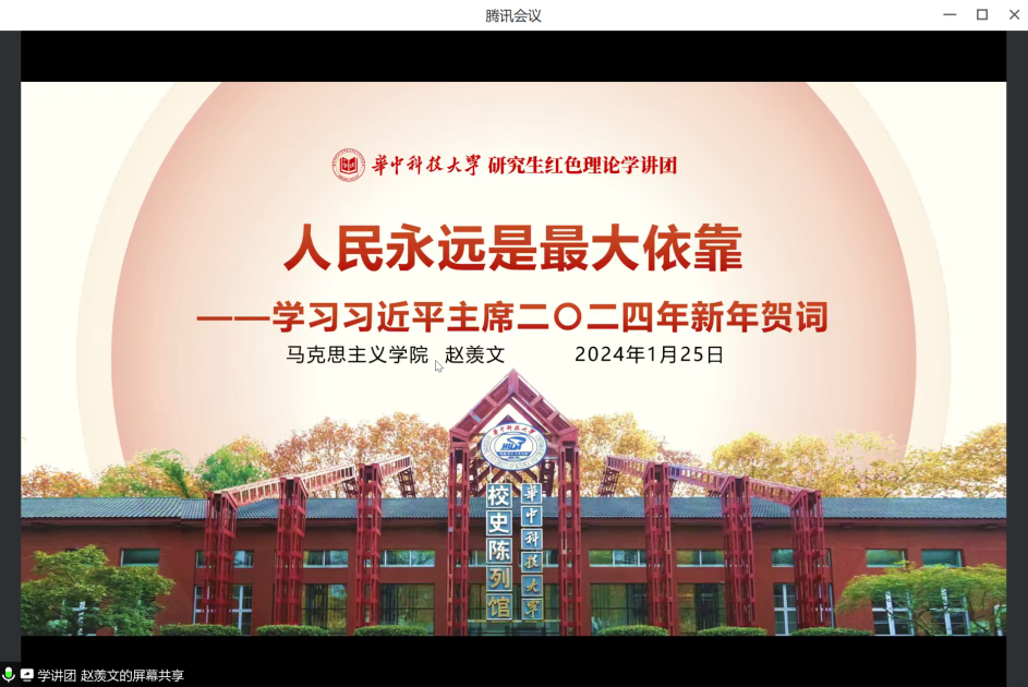 会议伊始,校研究生红色理论学讲团讲师赵羡文以《人民永远是最大依靠——学习习近平主席二〇二四年新年贺词》为主题带来宣讲。贺词中,习近平主席用平实的话语总结过往,展望未来,鼓励全国人民接续奋斗、砥砺前行。新年贺词满怀祝福、传递希望,鼓舞了参会的每一位党员。
