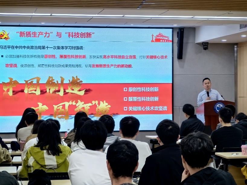 翟天佑老师围绕“什么是新质生产力”“新质生产力与科技创新的关系”“新时代背景下我们应该如何做”三方面展开分享,并强调科技创新是孕育新质生产力的核心动力。面对新时代的机遇与挑战,翟老师对广大青年提出了明确的行动倡议,鼓励在座的党员同志要胸怀壮志,向高而攀,勇于攀登科学技术高峰,始终保持对前沿知识的探索热情;向新而进,敢于突破传统思维束缚,积极参与创新创业实践,成为推动新质生产力发展的生力军;向实而为,脚踏实地,将理论知识转化为解决实际问题的能力,以实际行动践行创新驱动发展战略。