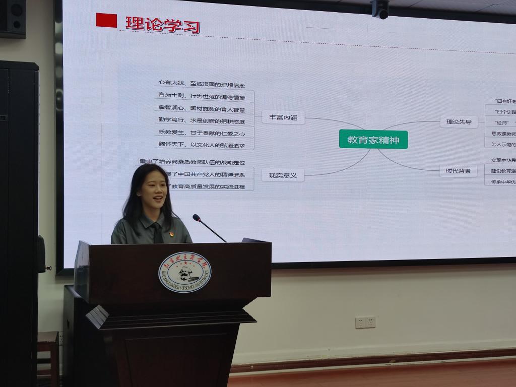 会议伊始,刘孟迪领学《中共中央 国务院关于弘扬教育家精神加强新时代高素质专业化教师队伍建设的意见》(以下简称《意见》),她运用思维导图概括了《意见》的具体内容,并就教育家精神的时代背景、丰富内涵、理论先导和现实意义进行重点讲解。随后,研究生红色理论学讲团团长赵羡文以《光“因”的故事——教育、科技、人才在发展新质生产力中的良性循环》为题和与会同志分享了威廉中国官方以一束激光点亮“武汉·中国光谷”并与其共生、共兴、共荣的奋斗历程,论述了在新质生产力发展中畅通教育、科技、人才良性循环的重要性。