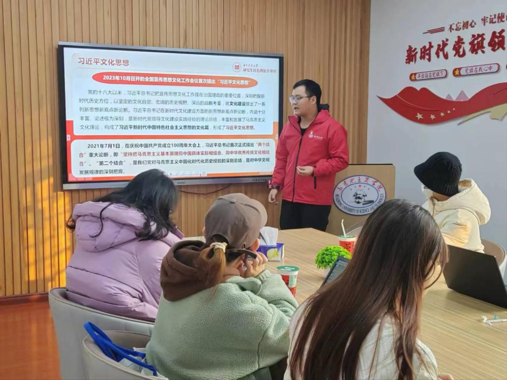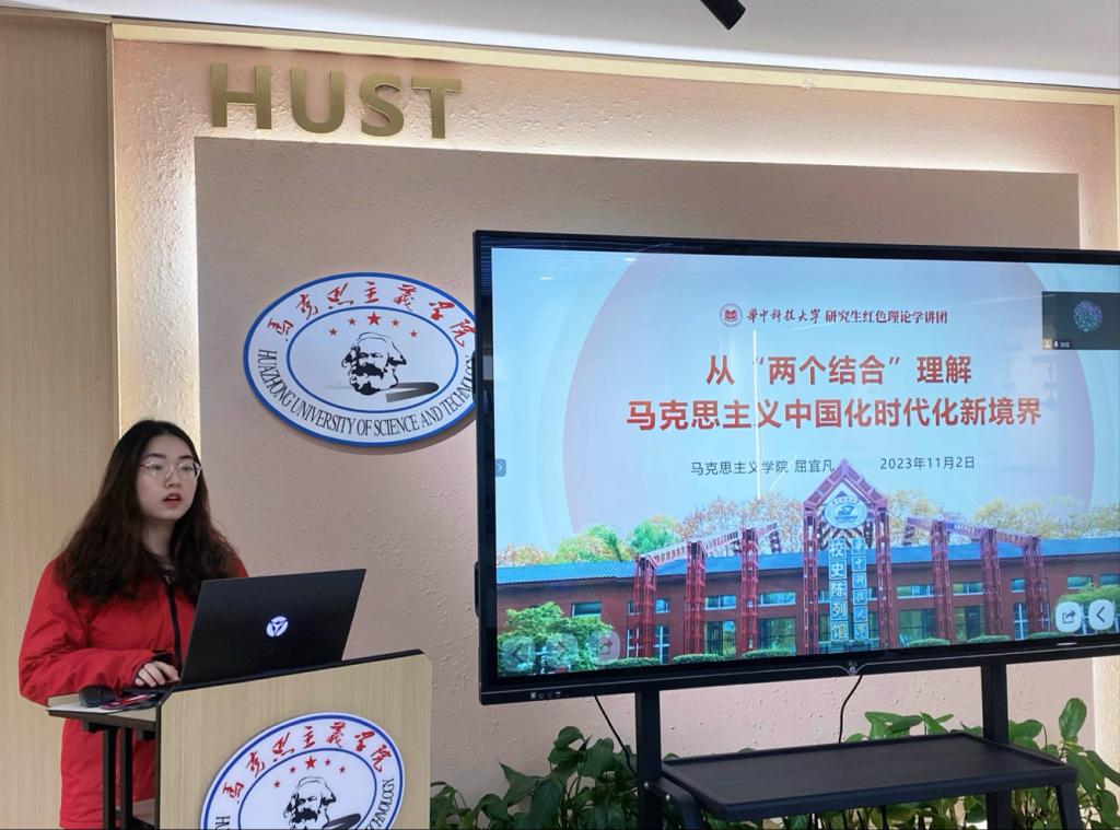 活动第二项,理论学习。团支部邀请研究生红色理论学讲团讲师屈宜凡、杨一博为大家作题为《从“两个结合”理解马克思主义中国化时代化新境界》的微党课分享。两位同学认真细致的讲解让支部成员感触颇深,大家结合自身对于“两个结合”的学习和研究,积极进行交流与讨论。