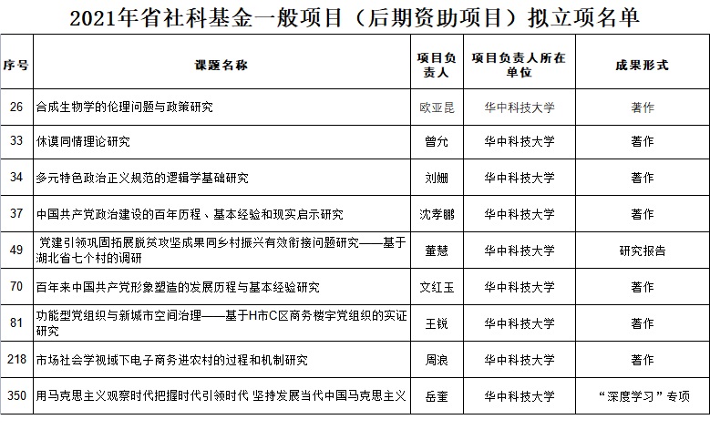 日前,2021年湖北省社科基金后期资助拟立项名单公布,我院欧亚昆、曾允、刘姗、沈孝鹏、董慧、文红玉、王锐、周浪和岳奎共九位教师申报的项目获得立项。