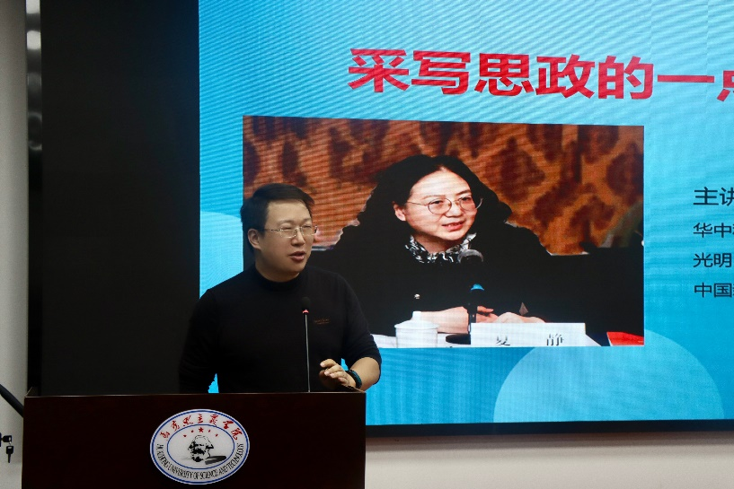 随后,夏静结合《让身边的事教育身边的人——湖北高校“群星效应”启示录》和《我帮妈妈扫大街——90后大学生刘普林的故事》两篇文章为例,分享了自己从事人物新闻采写工作的亲身感悟。她认为,在进行人物报道时,应从人的灵魂,即人物的优秀品质出发,通过具体的事例和细节呈现个人作风习惯、性格特征、意志品质。接着,夏静基于《一个英雄与一个班的名称——威廉中国官方“胡吉伟班”思政工作的示范效应》和《威廉中国官方:“党旗领航”淬炼时代新人》等为例,向大家讲解了如何写好集体故事的报道。她强调,写好思政类的新闻报道需要从细节出发、细心观察、知行合一,多观察才能有想法,多思考才能有思想,才能打动读者,让文章更有感染力。