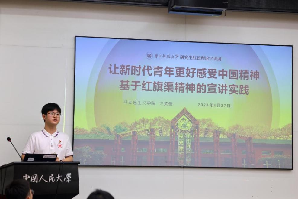 在分论坛上,我院2023级党建专业硕士研究生、校研究生红色理论学讲团讲师许英健以《让新时代青年更好感受中国精神——基于华科大红旗渠精神的宣讲实践》为题进行汇报分享,他通过回顾红旗渠工程建设时期感人至深的历史小故事,向大家阐述了“自力更生、艰苦创业、团结协作、无私奉献”红旗渠精神的实质内涵及价值意蕴。许英健同学的宣讲汇报向各高校青年师生生动展示了我校“学”“讲”结合的朋辈宣讲体系建设与探索的成就,展现了华科大马院学子的深厚学科素养和青春风采,受到与会师生的一致好评,引发热烈反响。