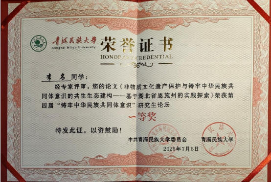 李名同学的研究聚焦湖北省恩施土家族苗族自治州的非物质文化遗产保护实践。论文深入剖析了当前保护工作中存在的现实困境,创新性提出应构建非遗保护与铸牢中华民族共同体意识共生互促的发展生态。他系统阐释了构建这一生态的路径框架,涵盖理论根基、核心支撑及保障机制等多维度。该研究既立足恩施州非遗保护的“小生态”实际,又着眼于中华民族共同体建设的“大格局”,致力于探寻如何将深厚的文化基因有效转化为驱动民族复兴的精神动力,并在强化中华文化共性的进程中,促进各民族文化的共同繁荣、互鉴共生。