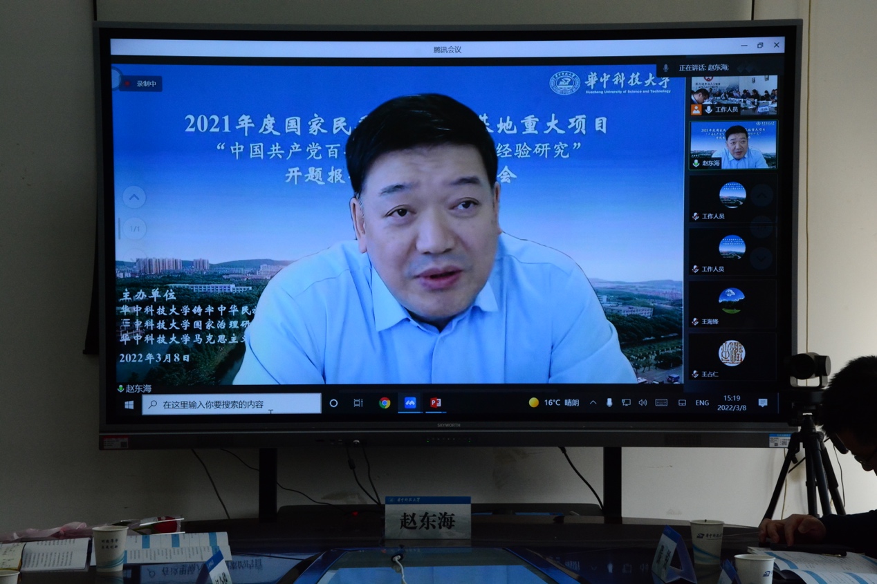 内蒙古民族大学校长赵东海教授对开题报告进行发言。他首先高度肯定本选题及课题组的开题报告,他指出,开题报告具有鲜明的问题意识,视野开阔、思路清晰、逻辑严谨、资料详实、结构紧凑,既有从历史的角度对党的百年民族工作进行历史经纬的抽丝剥茧,又有从现实的角度对成功经验的高度总结提炼,还有从未来的角度指出做好民族工作的重大意义。他强调,中国共产党百年民族工作的成功经验研究,还要从百年党史的高度系统梳理党的百年民族工作,处理好国家整体民族工作安排及民族地区特色创新做法的关系、党的民族工作和党的其他工作的关系、成功经验与失误教训的关系,并从历史逻辑、理论逻辑、现实逻辑的角度把党的建设一般性和民族工作的特殊性区别开来。最后,他提出,相关研究成果要体现国家水平、体现工程建设、体现团队合作、服务政策咨询、学科建设、人才培养等。
