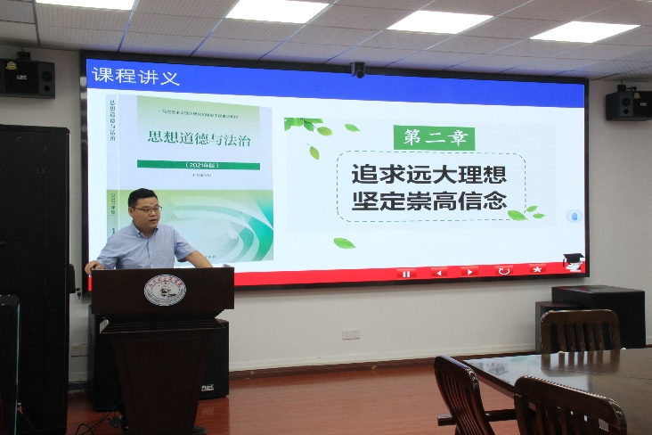 随后,备课会进入磨课环节。张冬静和杨昌华分别就新版“德法”教材的第一章和第二章内容进行说课试讲,其他老师就该部分内容的教学方法和教学要点提出相关建议。