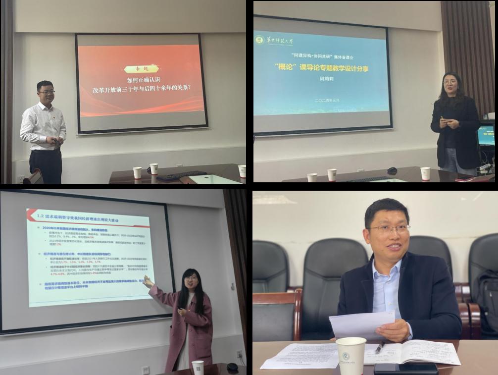 在集体备课环节,第三届全国高校思想政治理论课教学展示活动“教学竞赛单元”“毛泽东思想和中国特色社会主义理论体系概论”(本科)课特等奖获得者周莉莉、二等奖获得者雷志春进行了教学展示。雷志春老师围绕“如何正确认识改革开放前三十年与后四十余年的关系?”,通过问题导入,进一步分析“为什么会出现‘对立否定论’?‘对立否定论’错在何处?如何正确认识改革开放前后两个时期的关系?”三个问题,最后引导思考关于改革开放前后两个时期的关系之争给我国的社会主义建设带来何种启示。周莉莉老师围绕“‘概论’课专题教学设计分享”,采取情境教学法和归纳教学法,按照为何“化”?——如何“化”?——“化”出了什么?——怎样学?的思路,系统讲述课程导论部分马克思主义中国化时代化的历史进程与理论成果。