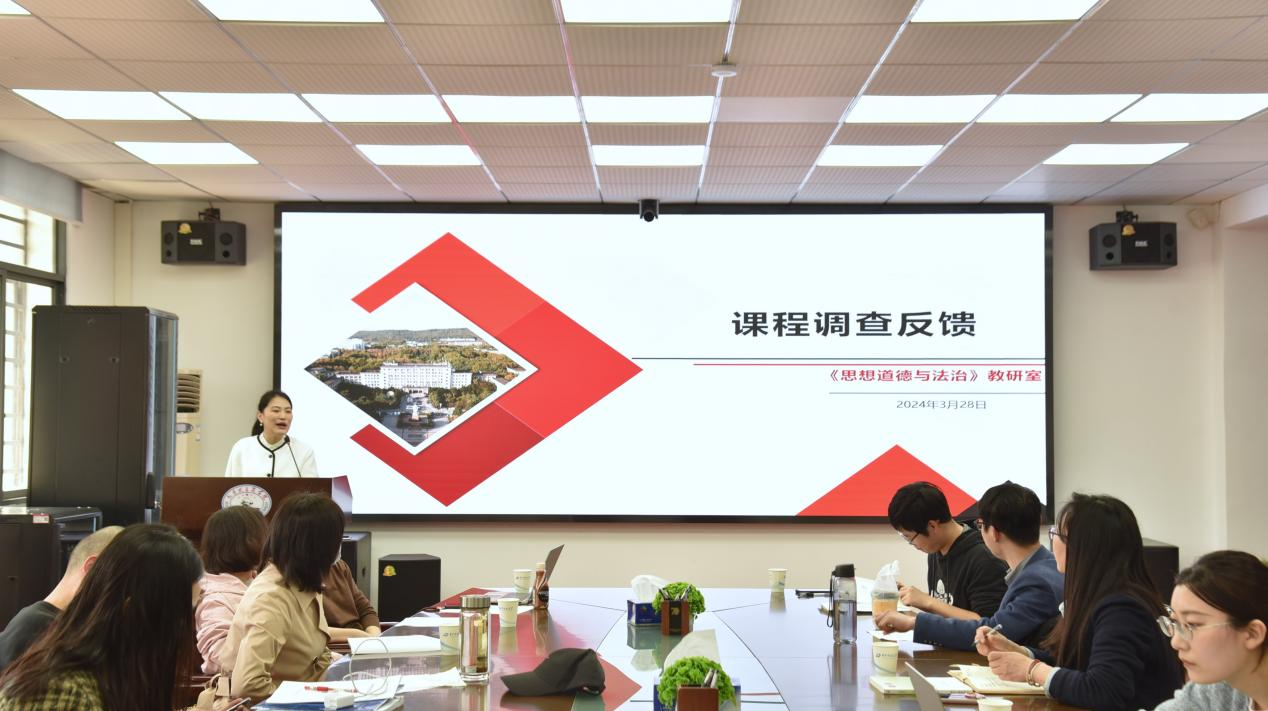 会议伊始,张冬静分别从整体印象、教学目标、教学方法、教学内容、教学效果及评价、学生学习情况六个方面向与会教师介绍了本次OBE教学评估问卷调查的具体情况。数据显示,学生们对德法课程的整体印象很好,大部分学生对教学中使用的素材和案例满意度较高,在开放性问题中学生们则主要针对考试范围的划定提出了建议。张冬静指出,本次调查中大部分学生对德法课程表示认可和喜爱,这既是对教师们辛勤工作的肯定,也是对教研室未来工作的鞭策,教师们应以此次调查为基础,不断改进教学方式,优化教学内容。