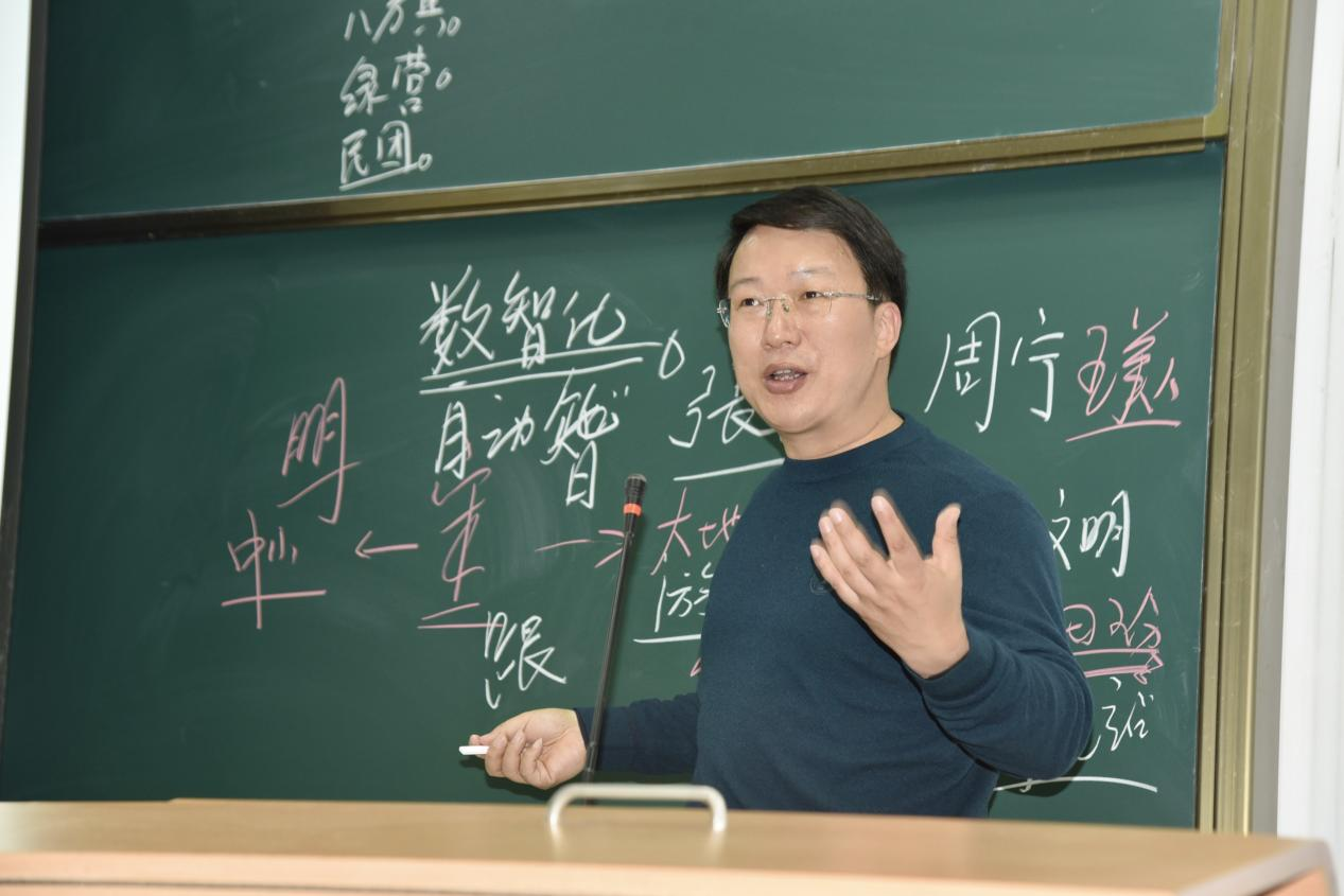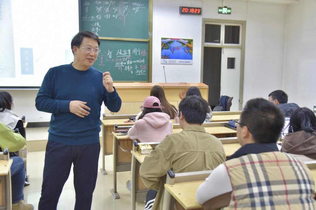 课上,岳奎老师围绕“从世界鼎盛到山河破碎”“从烽火四起到相约建党”“从流血牺牲到屹立东方”“从改革开放到伟大复兴”四部分,详细梳理了中华民族五千多年悠久历史的发展脉络,通过切入点式教学法,在滚滚历史长河中仔细甄选了几则详实且意义重大的小故事,带领同学们以小见大,在具体历史条件下感受时代的动荡、先辈们的苦难与民族生存的希望。岳奎老师从辩证唯物主义和历史唯物主义视角出发,运用生动幽默的语言和细节丰富的叙述,让同学们在引人入胜的故事中更加深刻地认识党情、国情、社情,不断反思个人的时代使命和个人存在于社会的价值。