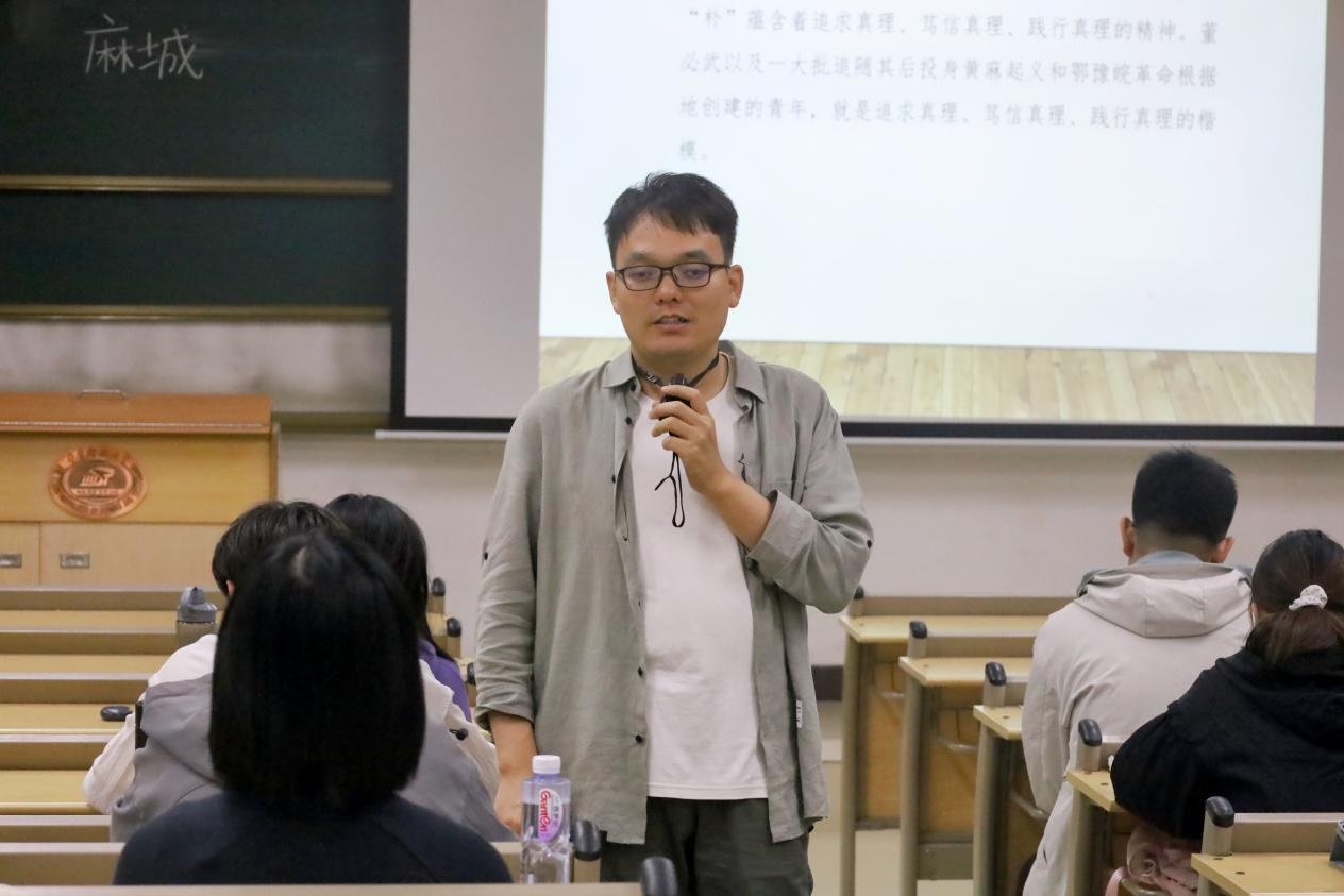 随后,马瑞老师以“朴诚勇毅”“不胜不休”两个关键词重点讲述了大别山精神的孕育和发展。他讲到,“朴诚勇毅”来源于大别山精神的孕育阶段,是董必武1920年创办武汉中学时为武汉中学制定的校训。其中“朴”就是艰苦朴素,“诚”就是忠诚、诚实,“勇”就是勇敢,“毅”就是要有恒心、有毅力,能够坚持。“不胜不休”来源于大别山精神的形成阶段。“不胜不休”源于红四方面军制定的军训,是指“不实现苏维埃新中国,不打倒帝国主义,就誓不罢休”。他指出,“朴诚勇毅”“不胜不休”这种原生态表述,具有浓郁的地域文化特色,彰显了大别山精神的文化特质。