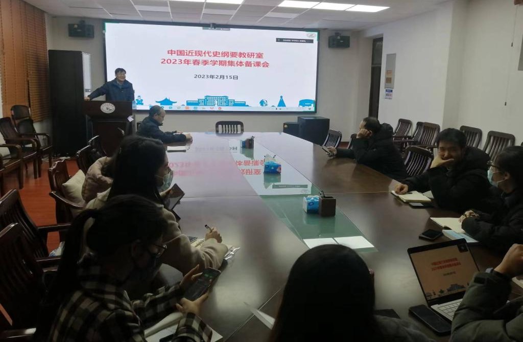 2023年2月15日晚7点,中国近现代史纲要教研室在学院203会议室举行春季学期第一次双聘教师集体备课会,会议采用线上与线下相结合的形式,全体双聘教师及专职教师代表杨炳祥、马瑞参会,纲要教研室主任夏增民主持会议。