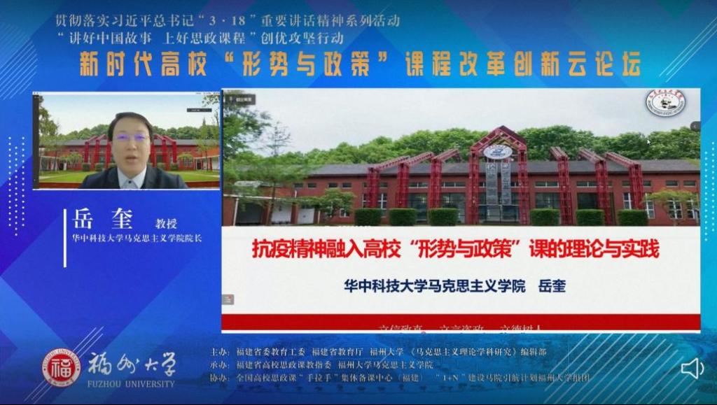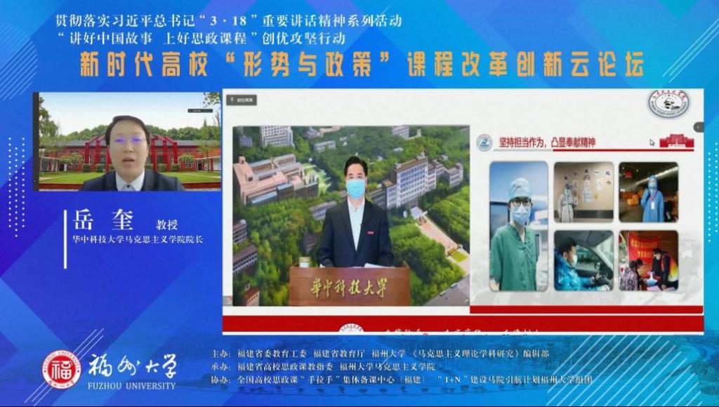 3月19日,由福建省高校思政课教指委与福州大学WilliamHill威廉希尔联合承办的新时代高校“形势与政策”课程改革创新云论坛在线上举行,来自全国不同高校近12000名思政课教师及学生线上参会。我院岳奎教授应邀参会并做题为“抗疫精神融入高校‘形势与政策’课程的理论与实践”的主题报告。