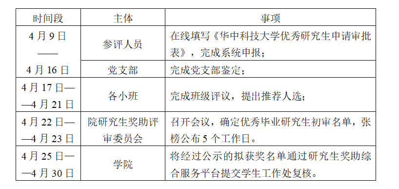 2.4月20日-4月30日,院(系)初审阶段。各院(系)学生奖助学金评审委员会确定本单位优秀毕业生初审名单,初审名单经院(系)党政联席会通过后,在本单位进行不少于5个工作日的公示。公示无异议的,提请学工处复核。