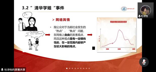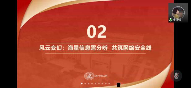 在微党课环节中,杜诗怡同志以《同塑网络生态,共建网络文明》为题为大家带来了一堂内容充实而又深刻的微党课。她首先以十九届五中全会对网络生态文明建设的要求谈道“加强网络文明建设,发展积极健康的网络文化”建设具有中国特色的网络文明是我们面临的重要任务;此外,她以发生在我们身边的、真实的事件、社会热点话题——近几个月一些院系学生的网络受骗事件、“清华学姐”事件等为案例,告诫青年党员要学会分辨海量信息,树立高度的网络安全意识,文明上网,理性发声;最后,强调作为时代先锋,我们应争做网络新青年,共筑网络新生态。