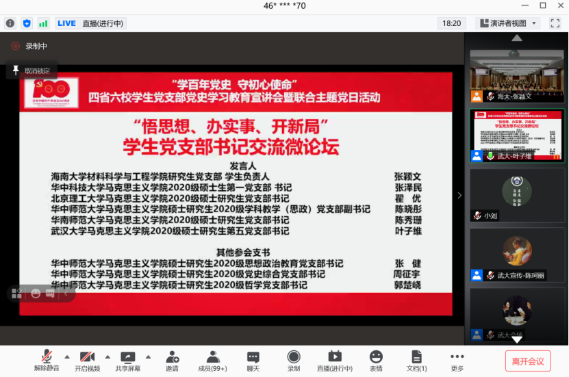 百年征程波澜壮阔、百年初心历久弥坚、百年大党风华正茂。今年是中国共产党建党100周年。习近平总书记在党史学习教育动员大会上指出,中国共产党的一百年是矢志践行初心使命的一百年,庆祝中国共产党百年华诞,是全党政治生活中的一件大事。为深入贯彻落实习近平总书记在党史学习教育动员大会上的重要讲话精神,深化“不忘初心,牢记使命”主题教育成果,引导广大青年学生党员传承红色基因,砥砺政治品格,筑牢信仰之基,以实际行动庆祝建党一百周年。2021年4月17日下午,我院硕士生第一党支部全体学生线上参加由武汉大学、海南大学联合威廉中国官方、华中师范大学、北京理工大学、华南师范大学六校学生党支部以线上线下相结合的方式开展了以“学百年党史、守初心使命”为主题的党史学习教育宣讲会暨联合主题党日活动。武汉大学党委研究生工作部副部长左征军、海南大学研究生处(研究生工作部)副处长郑育声、武汉大学WilliamHill威廉希尔党委副书记秦后国、海南大学材料科学与工程学院党委副书记周郭军出席活动,来自四省六校十一个支部的300余名学生党员参加了此次活动。活动由海南大学材料科学与工程学院党委副书记周郭军主持。
