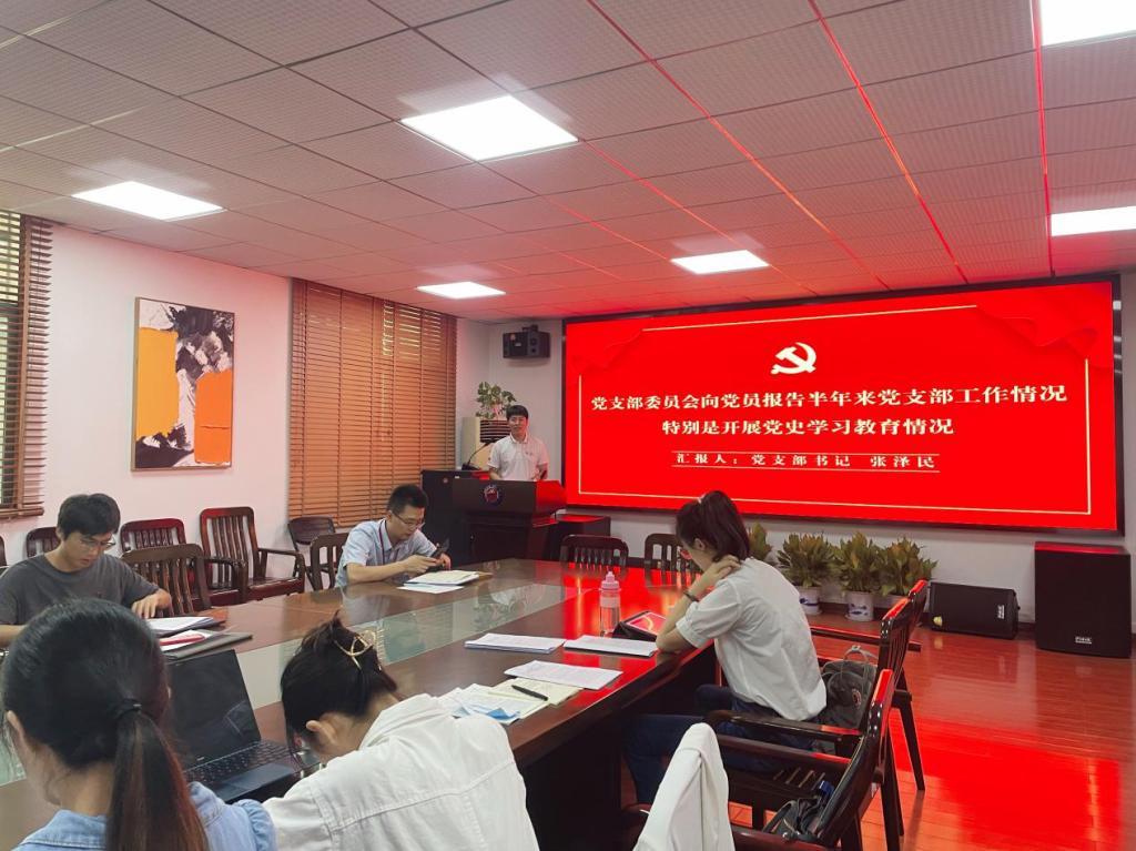 张泽民同志代表支部委员会向全体党员通报了半年来支部工作开展的情况,特别是对照党史学习教育的目标要求,回顾支部党史学习教育情况。认真总结党史学习教育的主要做法,支部能够多渠道宽领域开展党史学习教育活动,在走深走细走实的同时不断拓展“学党史”的广度;多主体深层次参与党史学习教育研习,在输入输出双向流动下不断挖掘“悟思想”的深度;支部引领组织联动构建党团研共同体,在立足本职服务同学中不断强化“办实事”的力度;育人为本发展为先精简形式丰富内涵,在注重内容规划思考中不断提升“开新局”的高度。除此之外,支部认真检视差距、查摆问题、分析不足,并提出了具体的整改事项、整改措施。