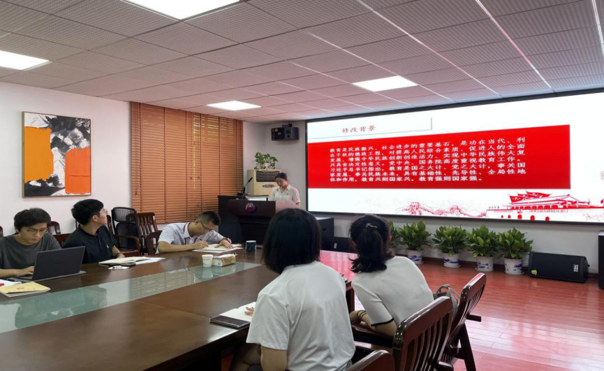 教育是民族振兴和社会进步的基石,是功在当代、利在千秋的德政工程。接着,黄秋月同志从“修改背景、修改内容和修改意义”三个方面带领大家一起学习《中华人民共和国教育法》,重点讲述教育法中的指导思想、教育地位、教育任务和刑事责任,并一一梳理了变化前和变化后的内容,让同学们在清晰的对比中学习教育法的相关内容。明确了党的教育方针,强调了当今的学校教育要努力培养德智体美劳全面发展的社会主义建设者和接班人。