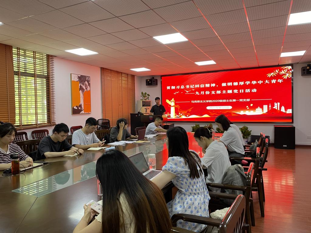 9月25日,围绕深入领会习近平总书记给全国高校黄大年式教师团队代表的回信精神,深入贯彻学习习近平总书记对新时代全面贯彻党的教育方针提出的明确要求,并结合我校2021年党风廉政教育宣传教育月活动,以文件学习提升对廉洁教育的认知和觉悟,实现正心铸魂。我院20级硕士第一党支部开展题为“贯彻习总书记回信精神,做明德厚学华中大青年”的主题党日活动,支部党员和积极分子参会。