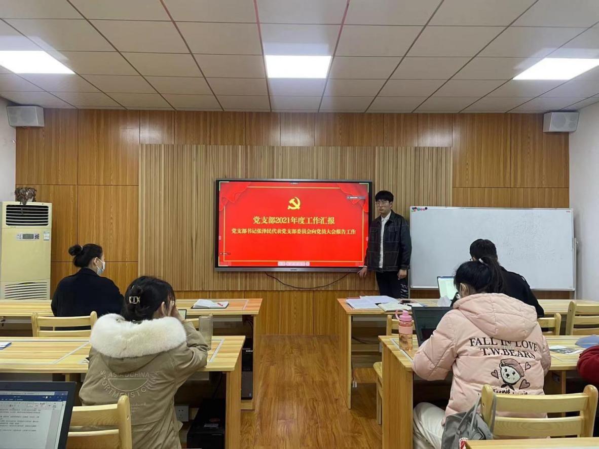 支部书记张泽民代表党支部委员会从党支部建设、支部活动的概览、支部存在的问题和未来发展规划四个方面向党员大会作2021年度工作汇报。在支部建设上,从党员发展与组织架构两方面入手总结了支部组织建设情况。接着,从10名同志入党、6次主题党日、4次特色活动、2次实践走访、1项集体荣誉这五个方面对支部半年来的实践活动、理论学习等方面进行一一汇报;也通过党小组交流谈心、深入调查的方式搜集整理支部党员对支部存在的问题及发展建议,为未来党支部的发展规划指明方向和贡献集体智慧。他就支部未来发展工作对全体党员提出了希望,要进一步加强支部建设,结合实际制定支部学习活动计划,做到有章可循;支部活动要结合学生需求实际彰显实效;紧跟时代形势,加强政治理论和业务知识学习,相互交流,共同提升,充分发挥每一位党员和积极分子的潜力,力争打造更有战斗力的基层党支部。