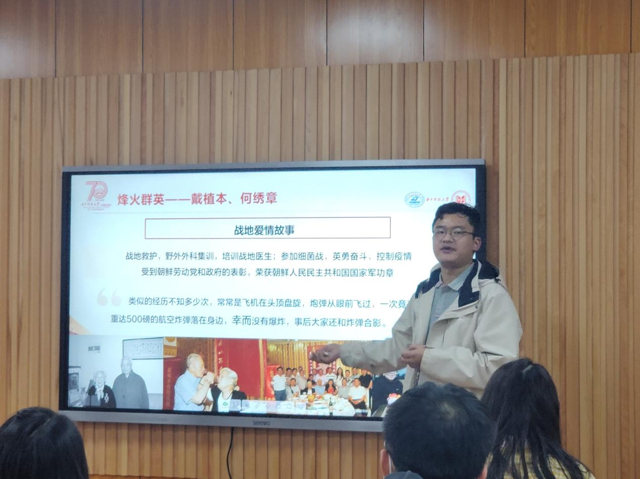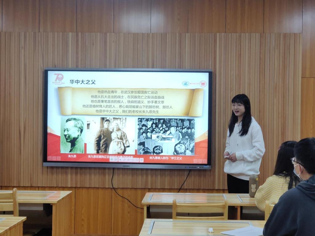 为讲好党史校史故事,传承华中大的红色基因,激发同学们的爱校荣校之情,支部成员汪建辉和贾露雅分别为大家讲述了“抗美援朝中的华中大”和“华工之父”朱九思的故事。