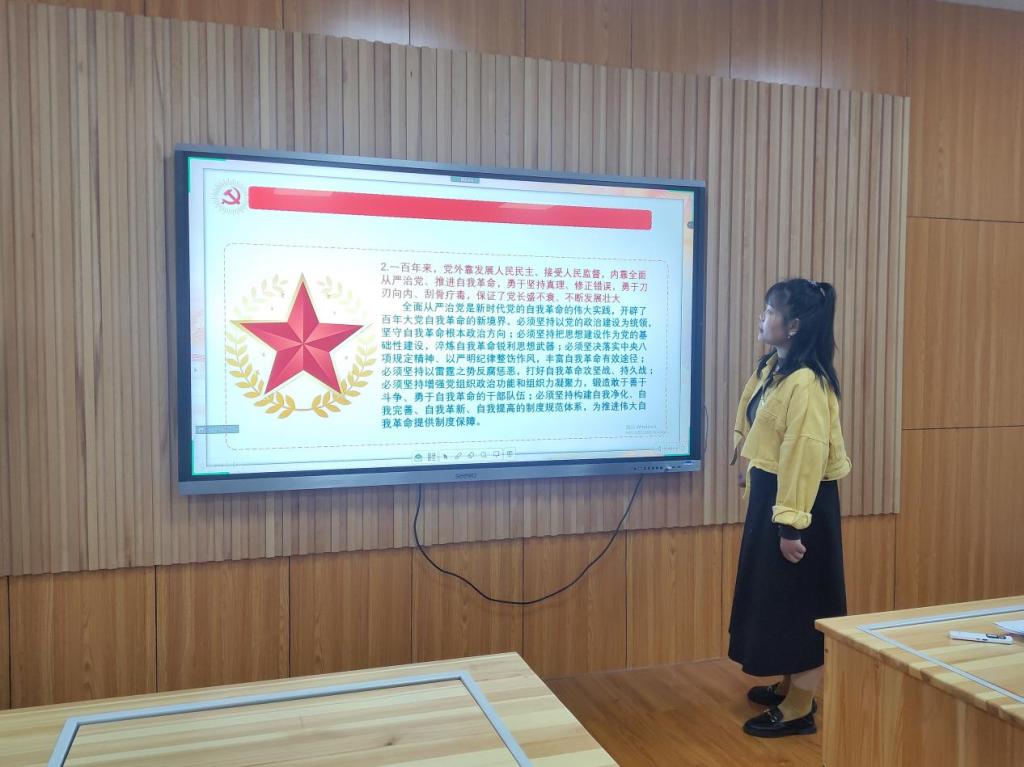 全面从严治党是新时代党的自我革命的伟大实践,支部成员肖丽敏从九个方面介绍了第十九届中央纪律检查委员会第六次全体会议的内容,带领大家回顾了党外靠发展人民民主、接受人民监督,内靠全面从严治党、推进自我革命的历程,并从实践创新、理论创新、制度创新的角度阐释了党勇于坚持真理、修正错误,勇于刀刃向内、刮骨疗毒的革命精神。随后,支部成员进行了知识测试,巩固理论学习成果。