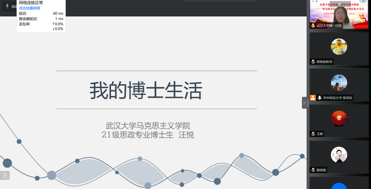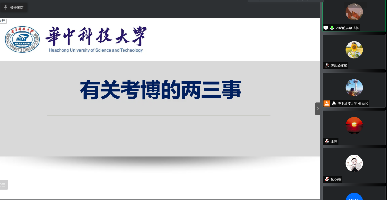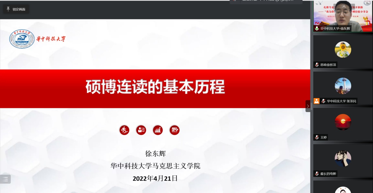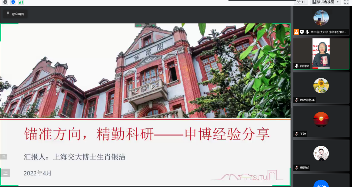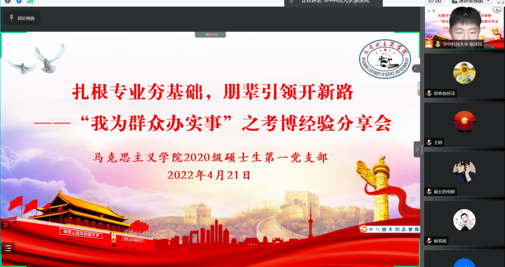 为激发马院研究生潜心学术、读博深造的热情,进一步提升20、21级硕士研究生的学术素养与研究能力,培育浓厚的学术氛围,满足同学们对于考博方面经验和知识的需求。4月21日晚,WilliamHill威廉希尔2020级硕士生第一党支部组织开展“我为群众办实事”系列活动第二期——考博经验分享会,邀请往届深造读博的优秀毕业生分享其考博读博的经验与感受,为同学们提供考博、读博的经验准备,更好地发挥朋辈博士研究生的引领、带动、示范、辐射作用。