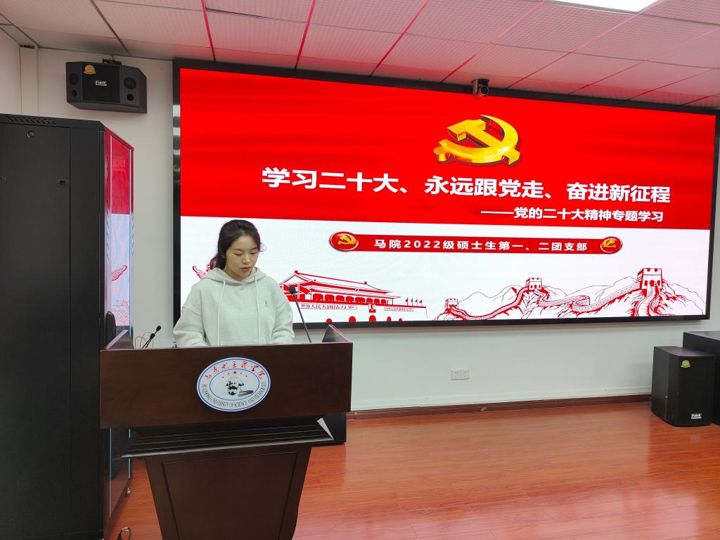 中国共产党第二十次全国代表大会于2022年10月22日在背景闭幕,为深入学习宣传贯彻党的二十大精神,2022级硕士生第一、二团支部于10月30日联合开展党的二十大精神专题学习主题团日活动。本次活动由2022级硕士生第二团支部书记邱卓娅主持,全体2022级硕士生团员参加了此次活动。