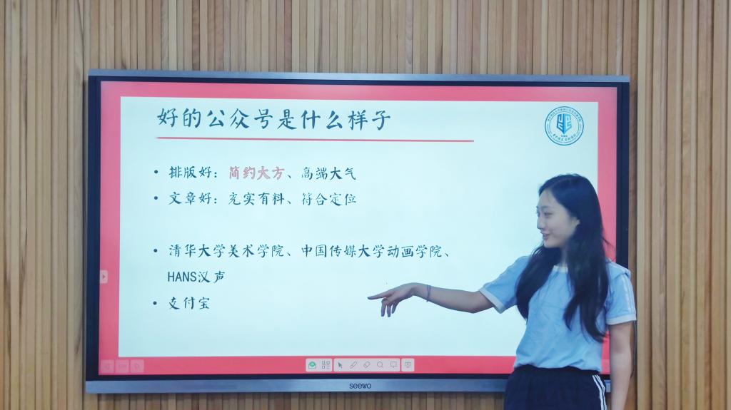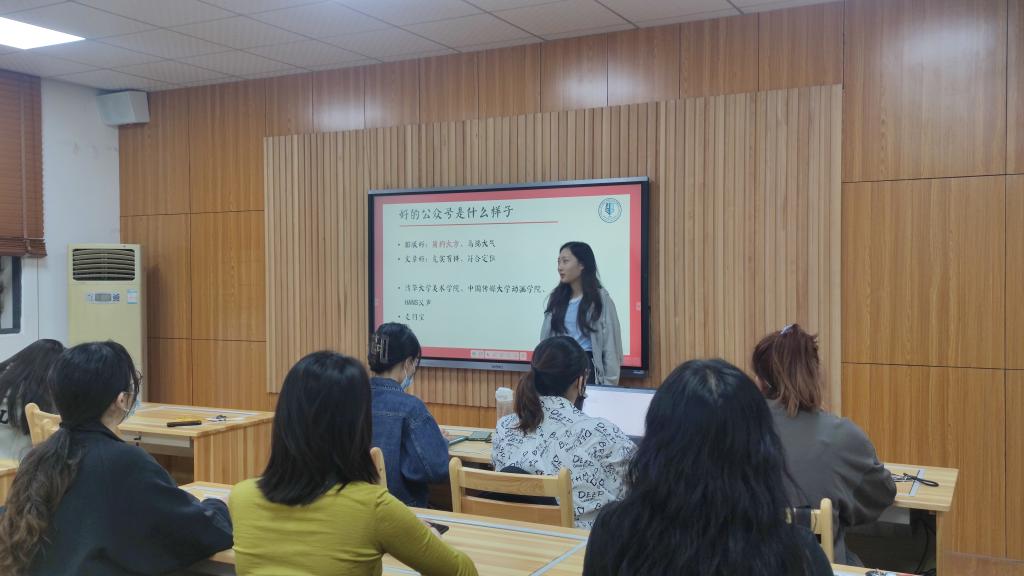 本次培训内容分为排版基础培训与摄影基础培训两部分。姚远从公众号范例、排版实操两个方面分享了排版的相关知识。首先,她向同学们展示了优秀公众号范例,通过对多个范例推文的评析,让大家充分了解排版的审美要求。接着,她从实操经验出发,带领同学们深入了解推文图片设计、推送内容组成、推文标题摘要、推文格式规范。最后,姚远从图文排版和图文风格两方面分别讲授了推文处理的细节。