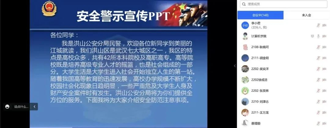 校园安全无小事,安全责任大如天。由于高校发生涉众电信网络诈骗案件多发,为落实《省教育厅办公室关于吸取相关案例教训做好高校防范电信网络诈骗宣传教育的通知》的要求,提升大学生安全防范意识,2022年12月26日晚,团支部联合计算机学院开展了一场线上校园防诈骗讲座活动,跟随喻家山派出所熊警官学习如何防范校园网络诈骗,活动开展,有效提高了同学们的防骗意识和能力,助力校园网络安全建设和构筑和谐校园。