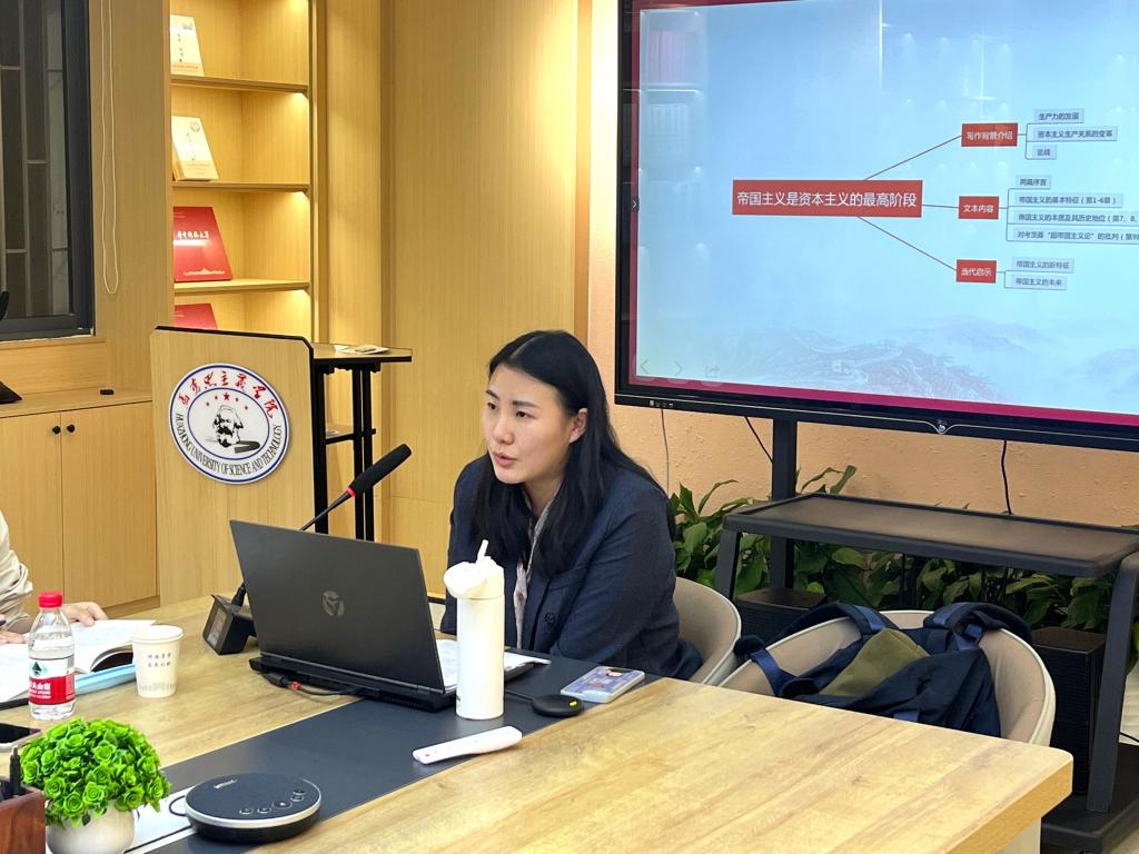 首先,李思思从写作背景入手展开讲解。她提到,资本主义的发展在19世纪末由自由竞争进入垄断阶段,为总结和分析资本主义发展中出现的新情况、新特点,列宁对资本主义垄断时期的生产力、生产关系作了全面深入的考察,从趋势中解释垄断资本主义的本质,通过本质对其进行反驳,完成了对西斯蒙第、马克思等人观点的继承,创立了完整的、科学的帝国主义理论,并写成《帝国主义是资本主义的最高阶段》一书。