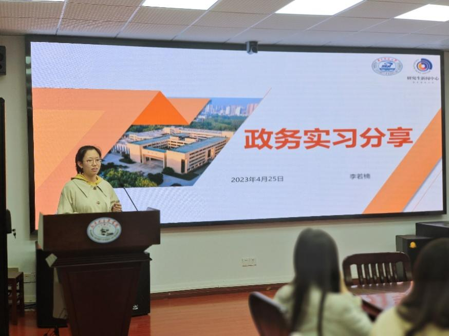 马克思主义中国化研究专业党支部组织委员李若楠同志为大家分享了青椰网实习的相关经验。她从实习渠道及准备、实习经验两个方面展开,向大家讲述了在国家知识产权局专利局专利审查协作湖北中心担任政策研究室实习生的经验感悟。青椰网湖北省青年大学生实习实训和就业信息网是共青团湖北省委为助力大学生实习就业而搭建的“一站式”信息化平台,李若楠同志详细说明了在青椰网查找实习岗位、投递简历、面试及入职的相关流程,并对事业单位的工作氛围、管理等进行了介绍。她表示,通过此次实习自己不仅深入体验了事业单位的日常工作,更自主地完成了一次设定情景的“就业实战”,获益匪浅。