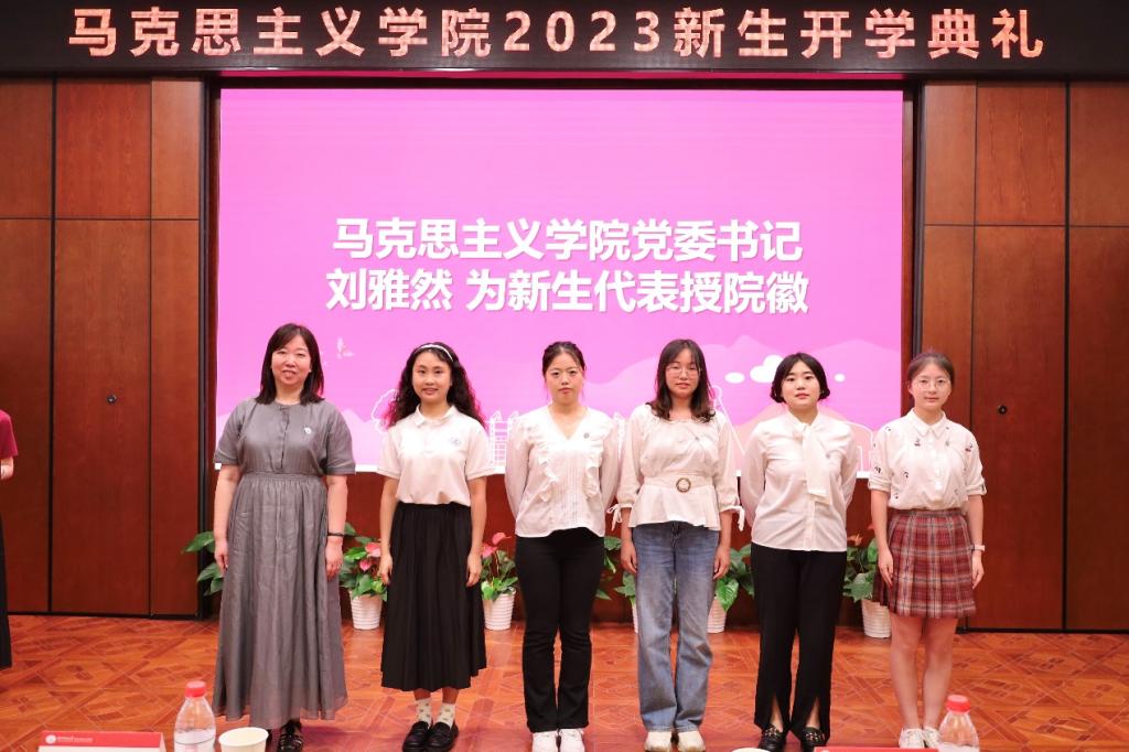 学院党委书记刘雅然为新生代表佩戴院徽。别在胸前的院徽熠熠闪光,承载着马院“立德树人、立信致真、立言咨政”的精神力量,激励着每一位新生踔厉奋发,勇毅前行。