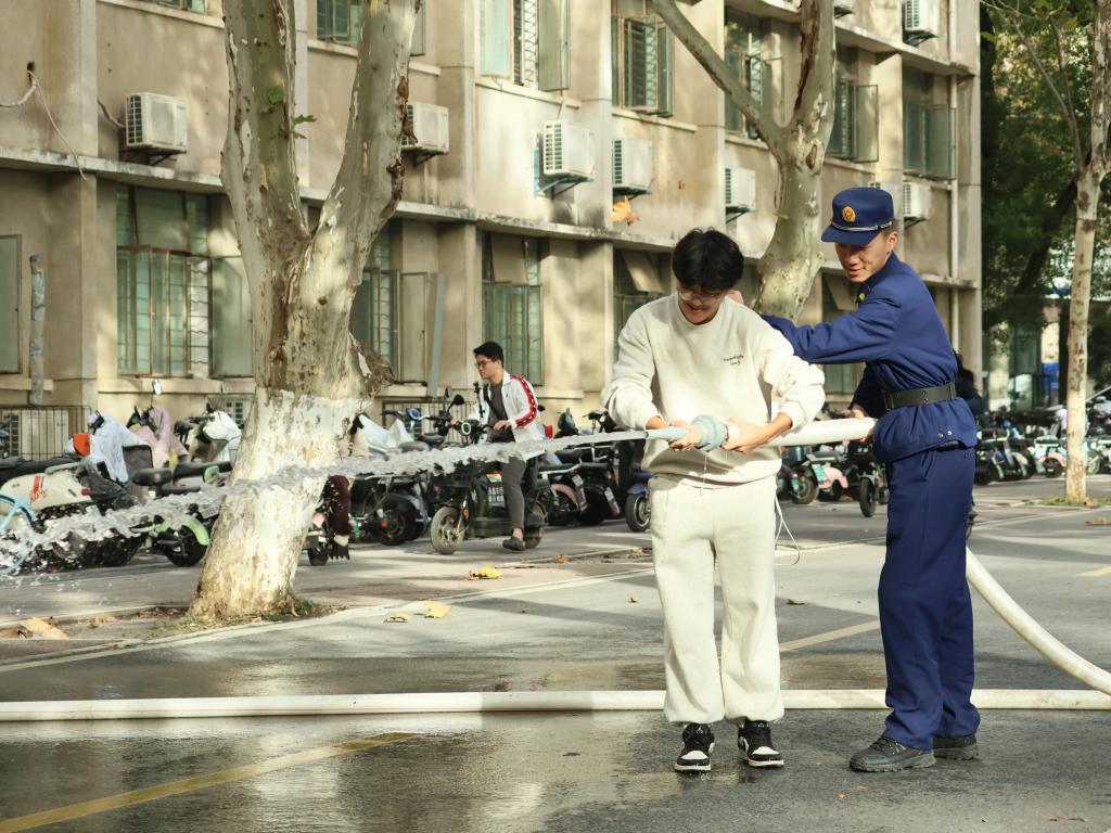 在逃生演习结束后,三院师生共同开展了消防技能实操演习。首先是灭火器的使用学习,在保卫处熊祥警官带领和指挥下,各位同学按照“一抽、二压、三对准”的使用口诀,将灭火器对准火苗根部扑灭火堆。接着,消防队员抽出消防栓的高压水枪,向各位师生讲解了高压水枪的使用方法和注意事项,并亲自示范使用方法。随后,各位同学也积极参与实操训练,学习掌握了消防水枪的使用技巧。