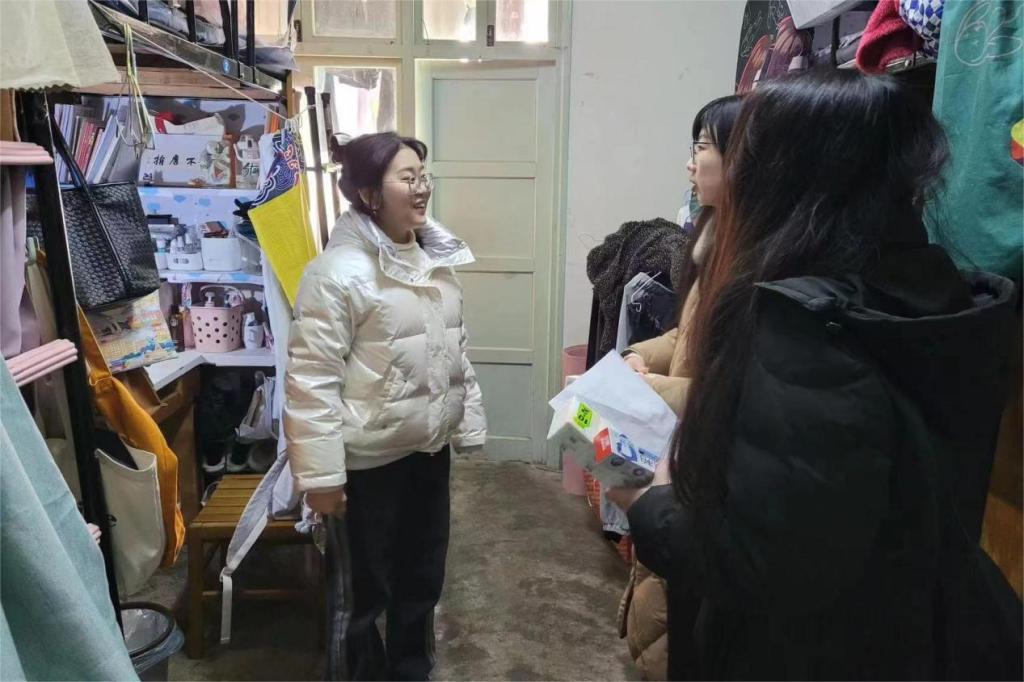 走访过程中,学院领导老师为返校学生送上了实用的生活物资,并与学生们进行亲切交谈,慰问学习生活等情况。刘雅然询问同学们春节在家过年情况,并叮嘱同学们注意用水用电安全,提高安全意识,创造良好的生活环境。