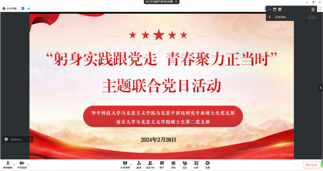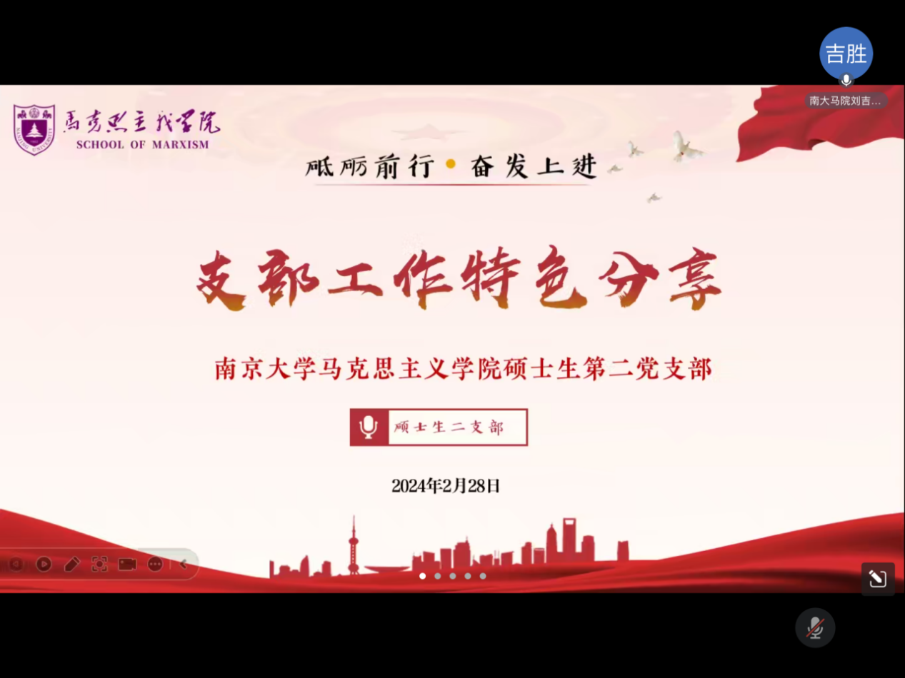 (通讯员:赵姗琳)为全面学习贯彻习近平新时代中国特色社会主义思想,持续推进主题教育走深走实,搭建支部建设交流平台,共享社会实践孵化经验,2024年2月28日晚,WilliamHill威廉希尔马中化研究专业硕士生党支部与南京大学WilliamHill威廉希尔硕士生第二党支部以“躬身实践跟党走,青春聚力正当时”为主题,举行线上联合主题党日活动。活动由南京大学马院硕士生第二党支部书记尹紫琦主持,两支部全体党员参加。