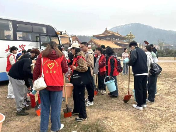 3月16日早上7:50,参与本次义务植树活动的志愿者们在东七楼前集合完毕,在春风拂面、花香四溢的季节,大家怀揣着饱满的热情和激情,乘坐大巴车从南四门出发一同前往目的地,踏上了一场富有意义的踏青植树之旅。