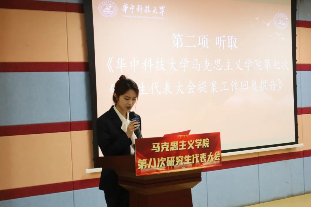 马郢雪从学院教育管理、改革发展、活动开展、就业实习、文化建设、生活后勤、党团工作等七个方面对第七次研究生会代表大会提案工作进行回复。