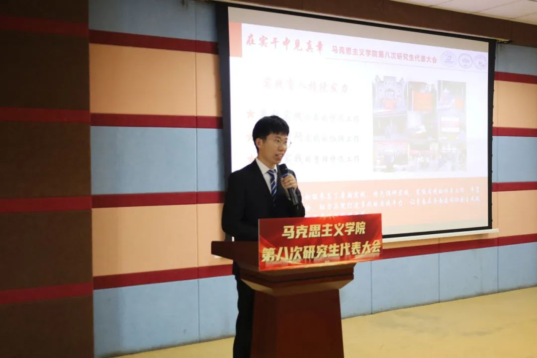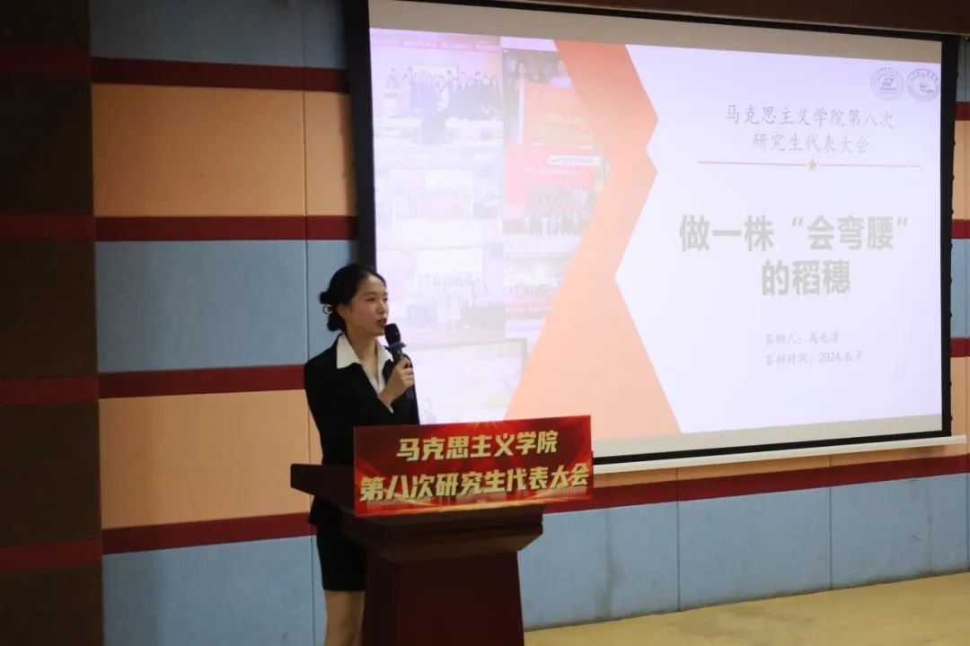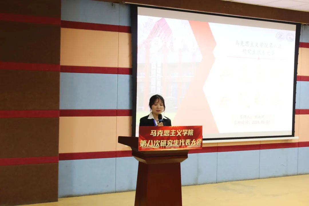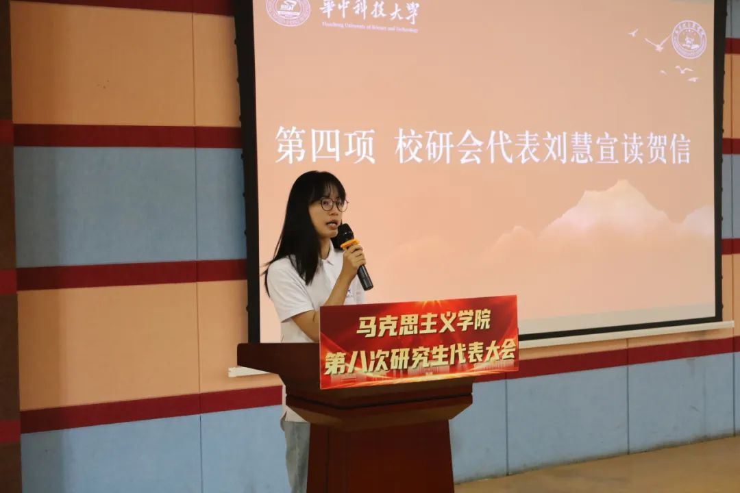 刘慧向大会宣读贺信。她表示,马院研究生会始终坚持以习近平新时代中国特色社会主义思想为指导,充分发挥了联系研究生群体的桥梁纽带作用,希望各位代表们积极发挥带头作用,切实为学院和学校的建设发展注入更强的动力。