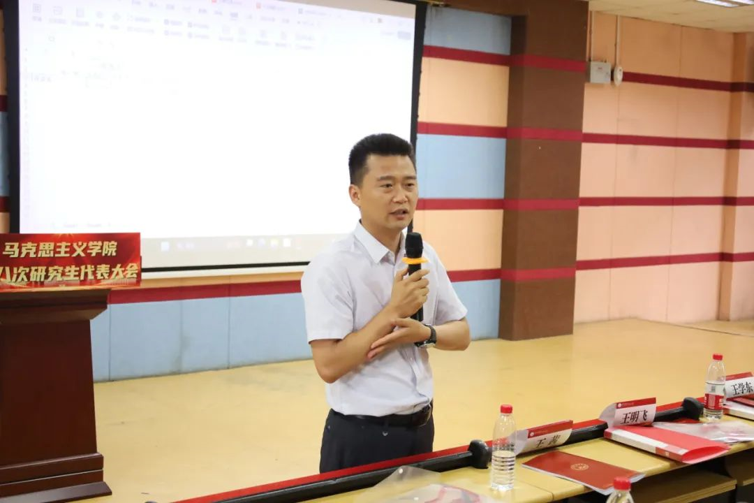 王明飞作总结讲话。他对上一届研究生会骨干的辛勤付出表达了衷心感谢,并勉励新一届研究生会学生骨干和马院学子充分利用好学院和学校提供的宝贵平台,不断提升自身综合素质,同时积极参加社会实践和志愿服务活动,将青春热血融入祖国波澜壮阔的新征程中。