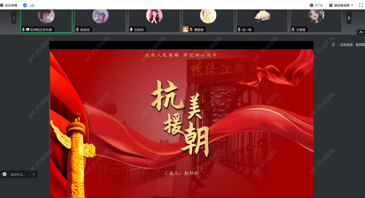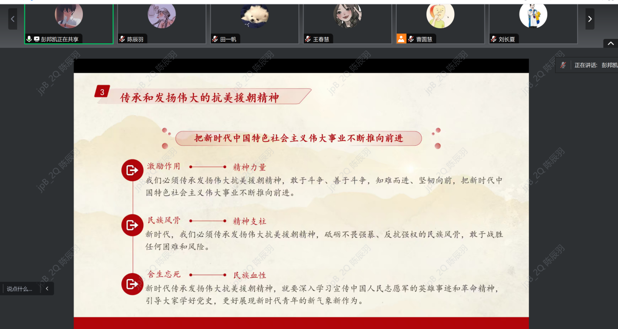 第三项,传承抗美援朝精神。在八一建军节来临之际,支部的彭邦凯同学结合自身参军经历以及参与“抗美援朝口述史”资料整理的经历,讲述了抗美援朝的壮阔历史。他指出,我们作为新时代青年要传承和发扬伟大的抗美援朝精神,推动新时代中国特色社会主义伟大事业不断向前发展。