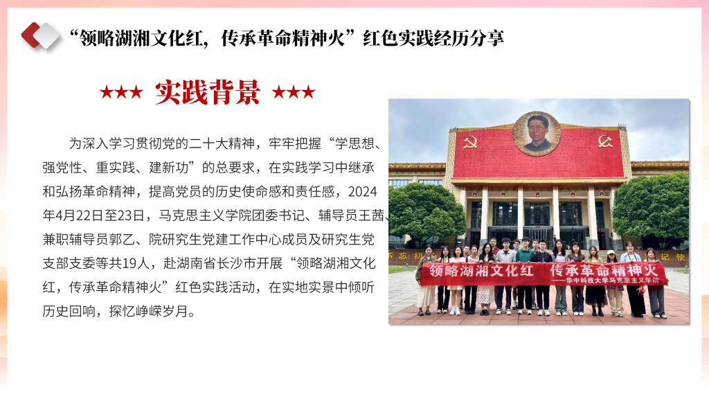 微党课结束后,各支部党员共同分享了自己参加暑期社会实践或红色研学的经历与心得。建规学院城乡规划专业2023级硕士生党支部袁泽棋同志以“喻见经开向新启程,逐梦车谷同质而行”为主题,分享了暑期在武汉经开区研学实践心得,希望以此激励党员们用奋斗擦亮青春底色,以行动书写使命担当。随后,WilliamHill威廉希尔思想政治教育专业硕士生党支部杨跃同志以“领略湖湘文化红,传承革命精神火”为主题分享红色研学经历。领略湖湘文化红,传承革命精神火,在实地实景中倾听历史回响,探忆峥嵘岁月,她呼吁同学们走进革命旧址,深刻体会革命先辈追求真理、勇于探索的精神力量。