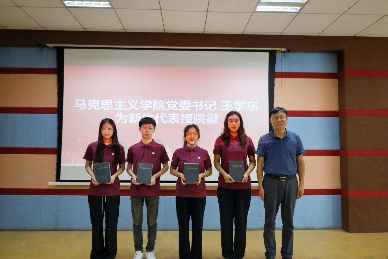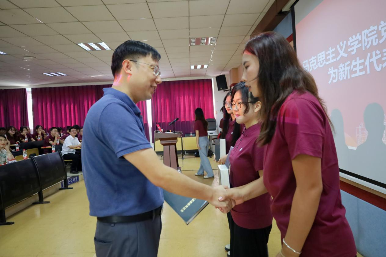 学院党委书记王学东为新生代表授专业书籍。新生代表手中捧着沉甸甸的书籍,象征着知识的传承与期望。马恩选集作为新生礼包的重要组成部分,寓意着新学年、新起点、新知识,饱含着学院对每位学子能在知识的海洋中扬帆远航的殷切希望。