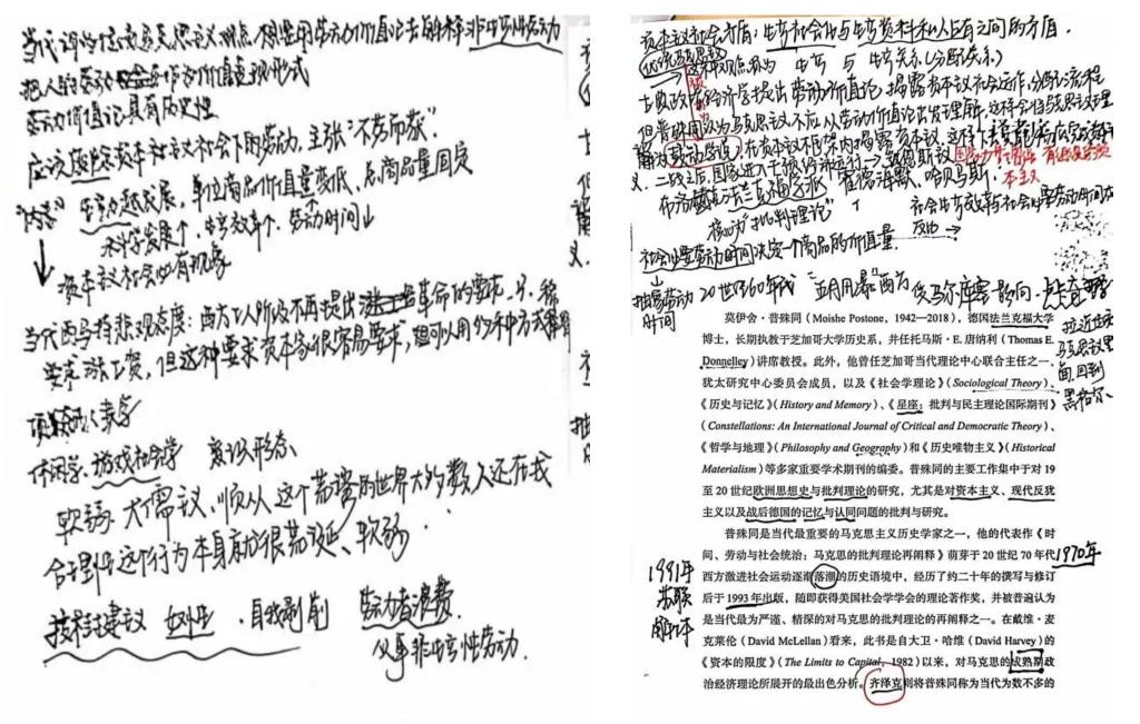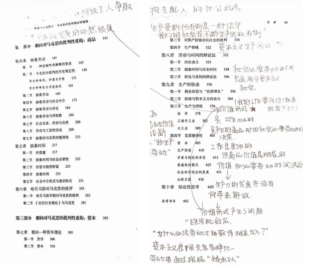 在导读过程中,蔡超老师和同学们共同探讨了传统马克思主义中生产力与生产关系、经济基础与上层建筑的理论框架,借用“跑步机效应”的概念,阐明了文中提出的观点——即在劳动者生产力不断提高的情况下,其劳动价值却相对降低的悖论。蔡超进一步指出,普殊同在本书中批判了将劳动价值抽象化的思维方式,并和同学们一起探讨了当代西方国家工人阶级不再积极争取革命性变革的深层原因。