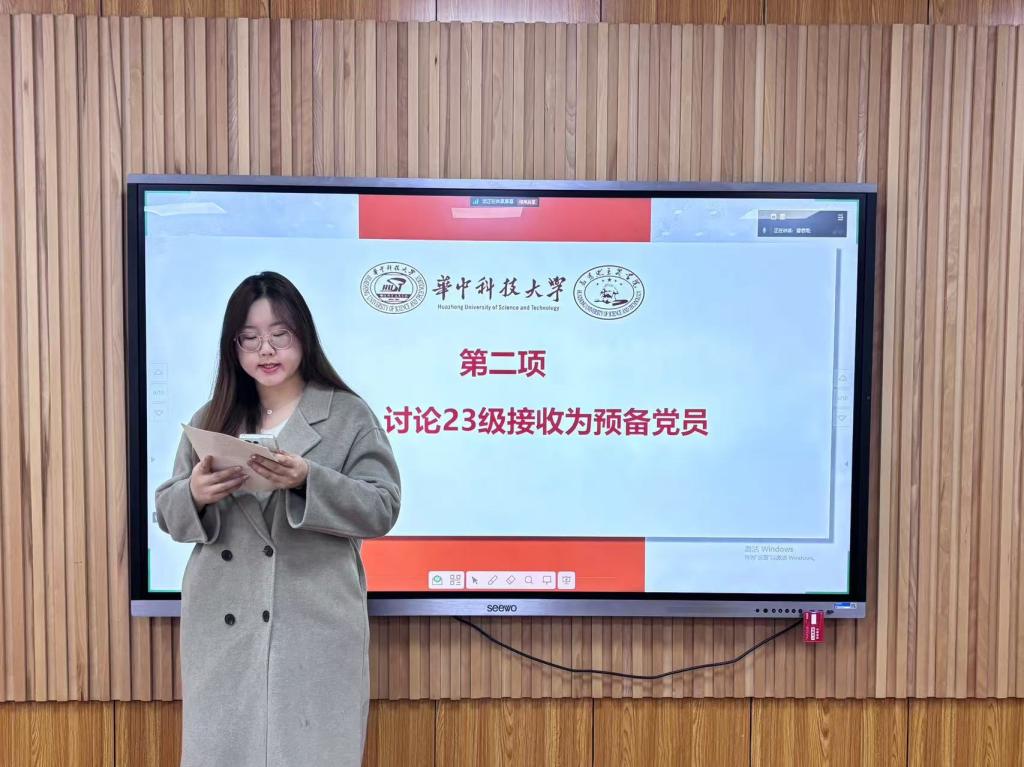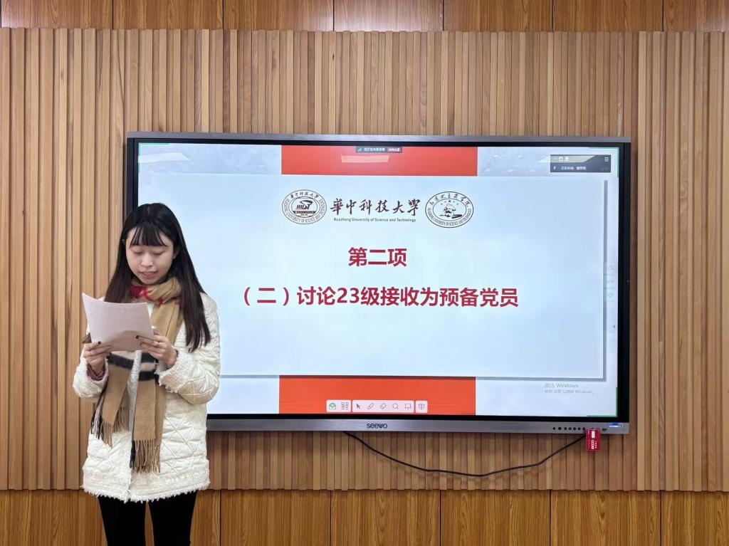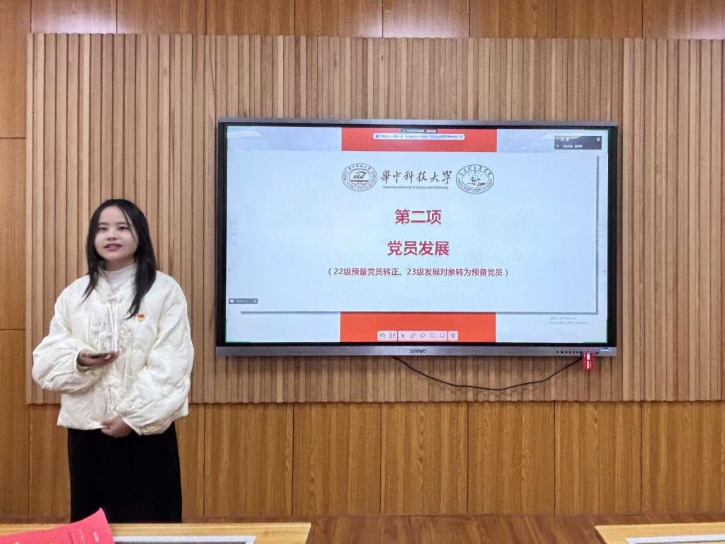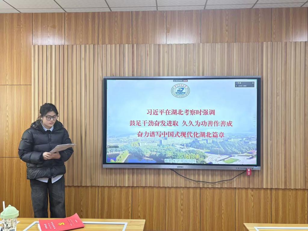 随后,在“理论集体学环节”环节,入党积极分子朱美颖从梳理习近平总书记的考察行程、重要工作指示以及自身学习感悟方面,带领支部同志更加全面深刻地学习习近平总书记考察湖北重要讲话精神,并激励各位同志要在开拓进取中发扬主动精神和斗争意志,为实现中华民族伟大复兴梦想贡献青春力量。