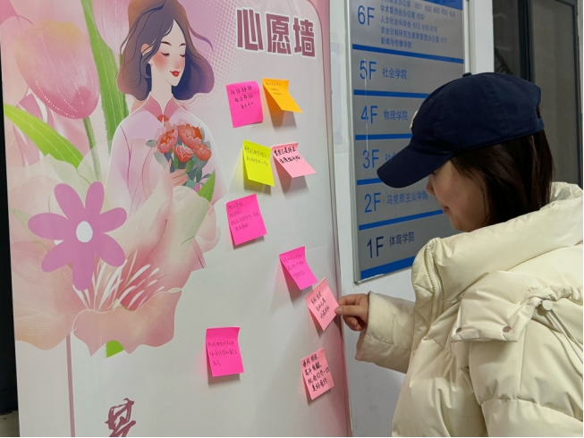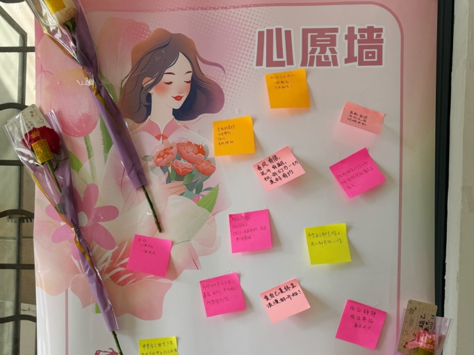 为了让学院每一位女同学都感受到节日的关怀与温暖,活动还特别策划了“宿舍送花”环节。3月7日晚,一场“惊喜行动”悄然展开。志愿者们悄悄在女生宿舍门口粘贴了小型花束和春日主题祝福卡片。花束以康乃馨和香槟玫瑰为主,搭配精心设计的祝福卡片,营造着温馨浪漫的节日氛围。这份“不期而遇”的浪漫让许多同学直呼:“这是最特别的节日礼物!”