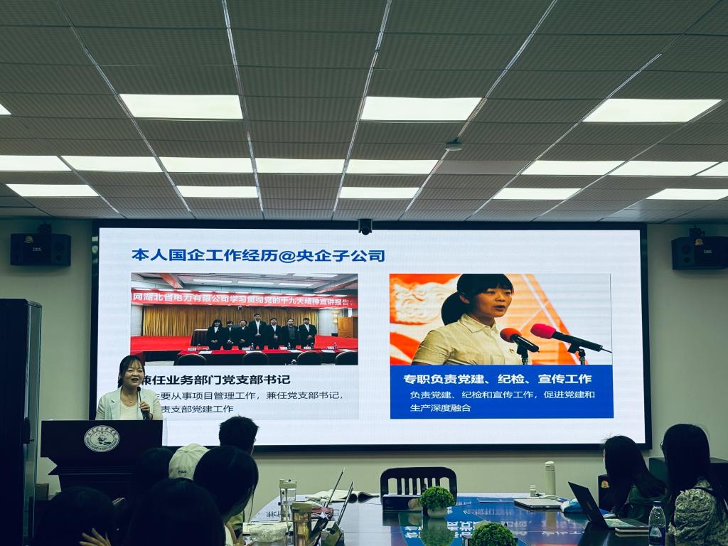 紧接着,李文静向大家分享了六年国企工作经历所积淀的工作感悟。她以国企的分类出发,对同学们如何选择行业、企业给出诚恳的建议,并以“相对稳定”“充满活力”“舞台宽阔”为关键词精准概括了自身对国企的独到见解。随后,李文静聚焦青年如何在国企成长和发展,提出既需动态管理自身职业规划,也要在提升业务能力的基础上建立良好的人际关系,同时注意劳逸结合愉悦身心。李文静细致入微的分享既扫清了同学们心中的求职迷雾,也进一步帮助同学们树立了正确的求职方向。