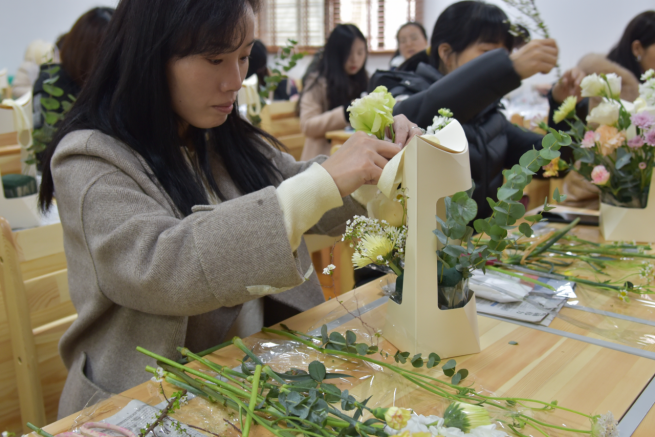随后,花艺老师从花艺作品介绍、作品整体形态、花材的分类认识、实用的花艺小技巧四个方面为全体女教师介绍了永生花的制作以及鲜花的搭配技巧。