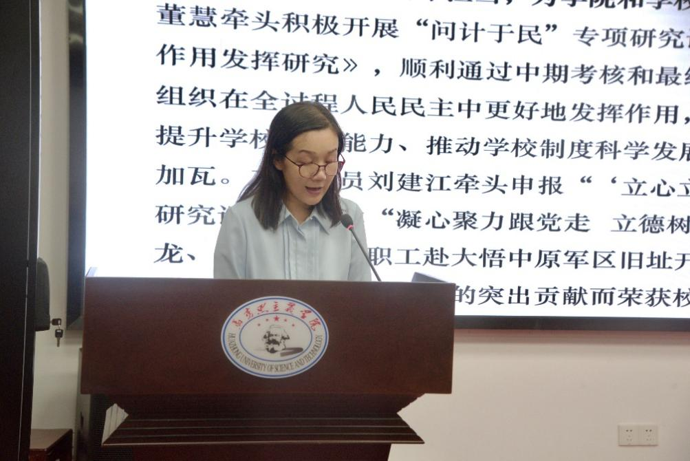 接下来,学院工会主席董慧作工会工作报告。她指出,学院工会在过去的一年多来,始终坚持以思想引领使命担当,积极开展上传下达等组织宣传工作,同时为教职工搭建各类服务平台、提供生活保障,营造了良好的文体生活氛围。她强调,学院工会将继续在学院党委的正确领导下,服务学院中心工作,扎实推进各项工作有序进行。